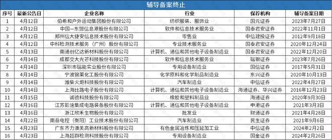 4月12日-5月2日,有16家公司境内(沪深两市)发行上市辅导备案终止。