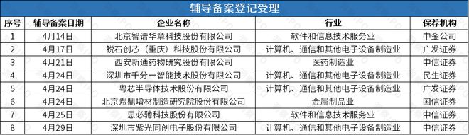 4月12日-5月2日,有8家公司境内(沪深两市)发行上市辅导备案登记获受理。