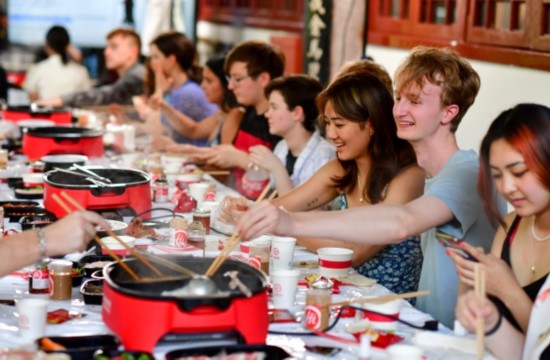 在现场,来自耶鲁大学、宾夕法尼亚大学、布朗大学等高校的30名美国师生以及西南交大的师生们,在成都陕西会馆的百年川西庭院里体验到了海底捞外送的定制团餐。服务人员在现场详细讲解了每个菜品涮煮的时长、不同调味小料的调制方式。4名在7月过生日的美国大学生体验到了“海底捞式生日祝福”的惊喜,席间的川剧变脸、特色捞面表演也引起众多海外大学生参与。