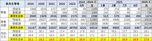 前期常规燃油车价格持续上升,市场萎缩在中低端很明显,而高端萎缩慢,因此从2019年的15万元上升到2023年的18.3万元。2025年随着高端燃油车的较快萎缩,1-8月的均价降低到17.0万元,8月下降到16.9万元,燃油车购买群体买车逐步稳定。